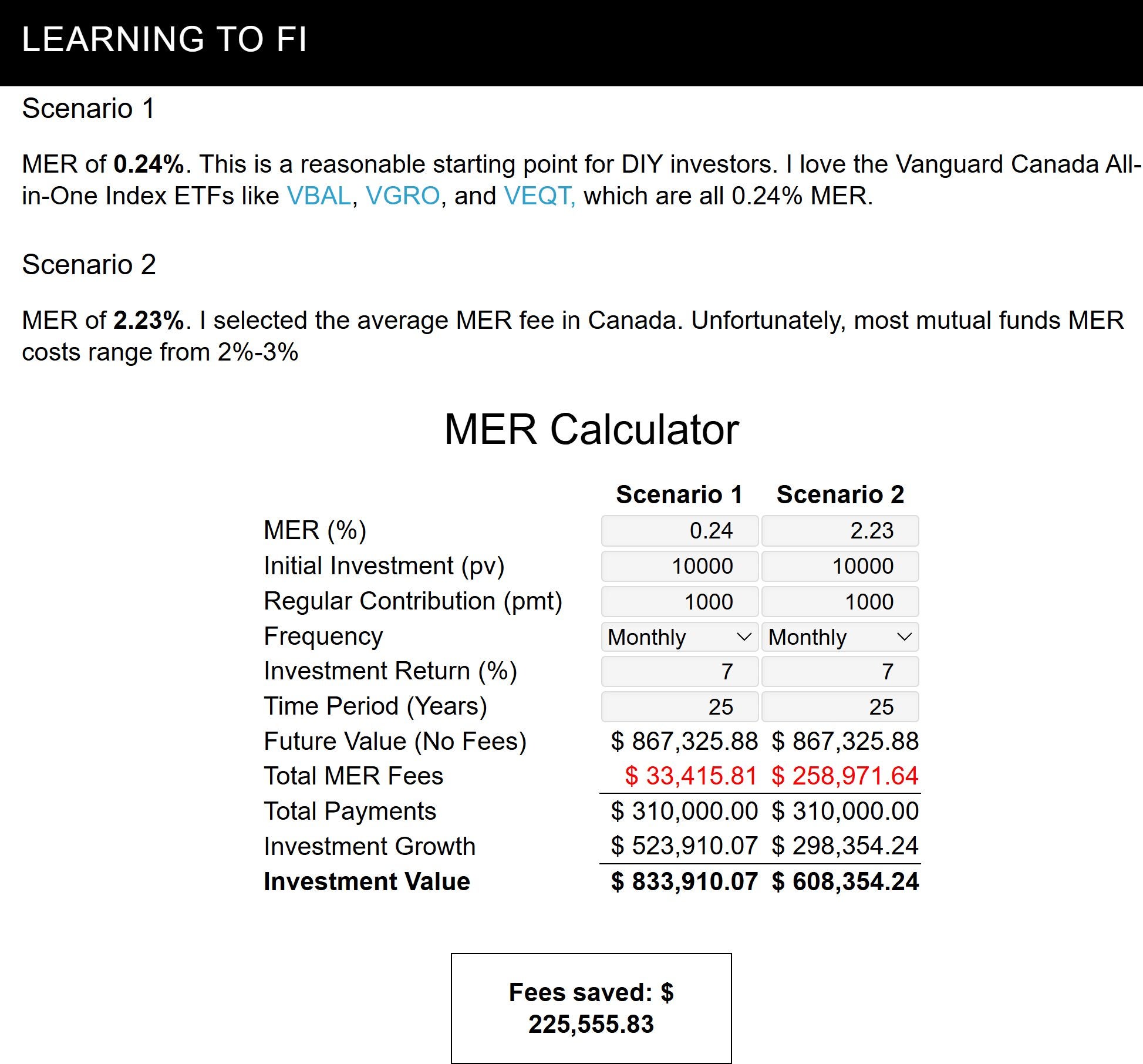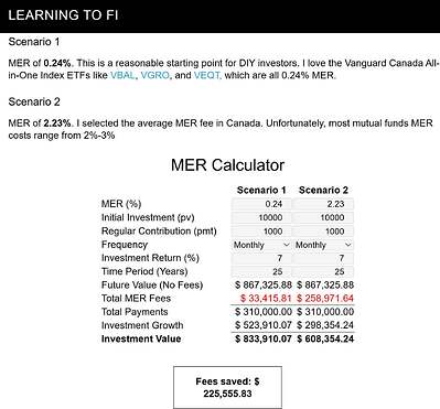 另一个更重要的提醒,如果您投资基金或ETF时没有特定的策略,请检查您的% MER(管理费率:每年为运营基金而支付的费用,占投资资产的百分比)。人们总是忽略这一点,结果它吞噬了他们退休金的很大一部分——见下图。当然,要合法地避免被骗。