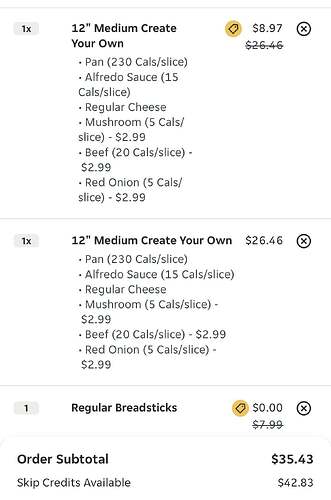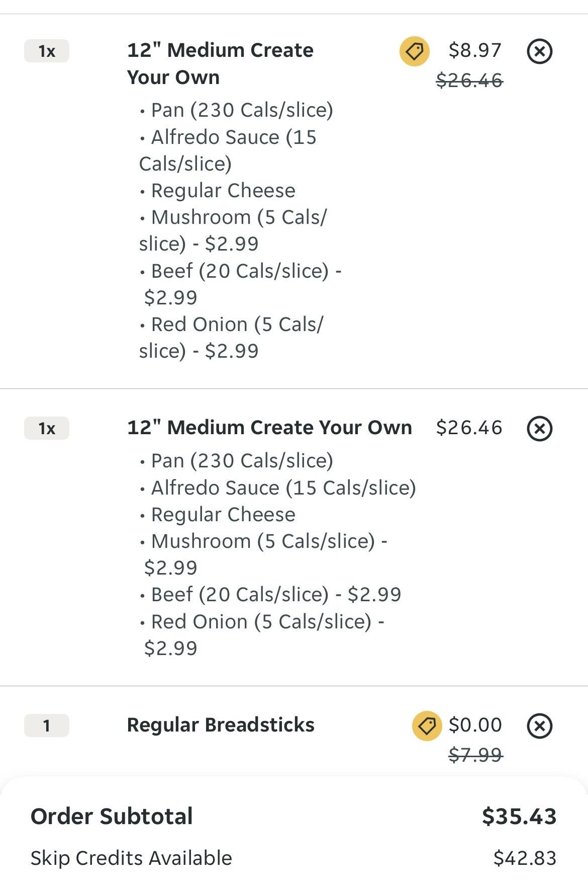 通过 Skip 应用在 Pizza Hut 订购两份中号自选三种配料比萨和常规面包棒,仅需约 20 $(自取适用)。具体供应情况可能因门店而异。