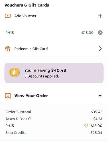 我同时拥有 Skip+ 会员,在完成两笔 30 $以上订单后可获得 10,000 积分。若在 10 天内再完成一笔订单,约可额外获得价值 4 $的积分(10,000 ÷ 2 × 0.8),这使得实际成本降至 16.03 $。实际效果可能因人而异。