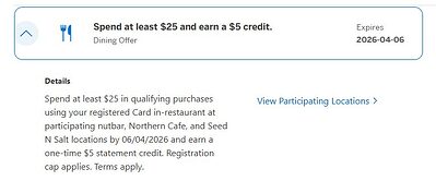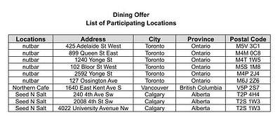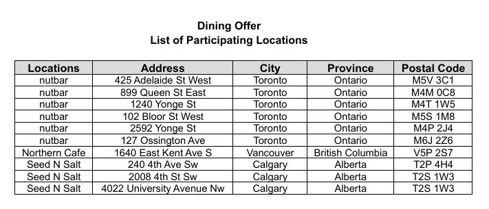 在参与活动的nutbar、Northern Cafe和Seed N Salt门店内,使用您已登记的卡片进行符合资格的消费至少25$,截止日期为2026年06月04日,即可获得一次性的5$账单抵扣。登记名额有限。适用条款。
