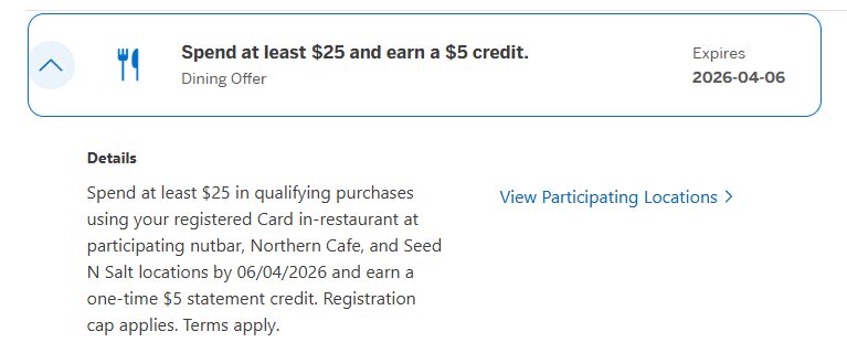 [American Express] Spend at least $25 and earn a $5 credit.(nutbar, Northern Cafe, and Seed N Salt)
