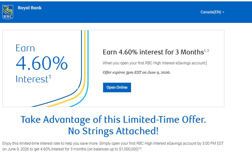 RBC- High Interest e savings 利率 - 开户后90天内有效,年利率4.60%。
