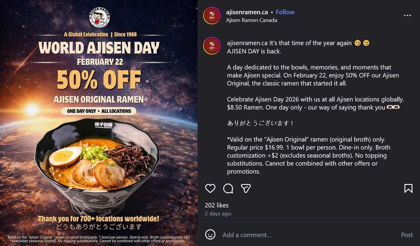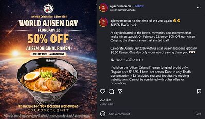 [ON] February 22nd: $8.50 Original Ajisen Ramen (50% off RP $16.99; 1 bowl/person; dine-in only) @ all locations