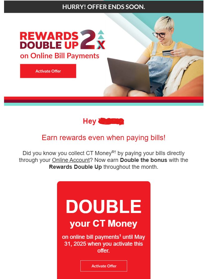 5月18日收到Canadian Tire Bankmailto:customerupdate@e.ctfs.com的邮件,内容是通过在线账单支付可获得双倍奖励。